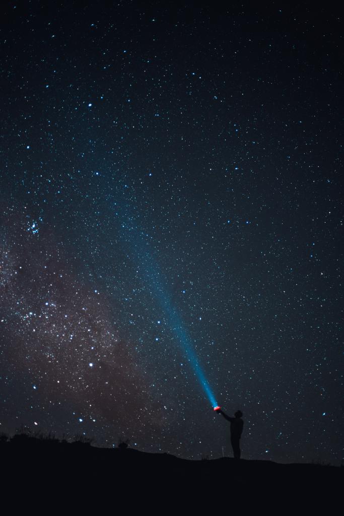 Figure shining flashlight into the night sky. Credit: Pexels.