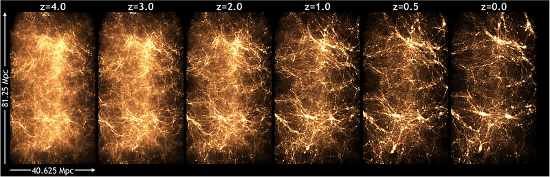 This simulation and the image provided gives us a better understanding on how matter is distributed and how gravity causes dark matter to clump and eventually form galaxies, stars, and planets in the universe.