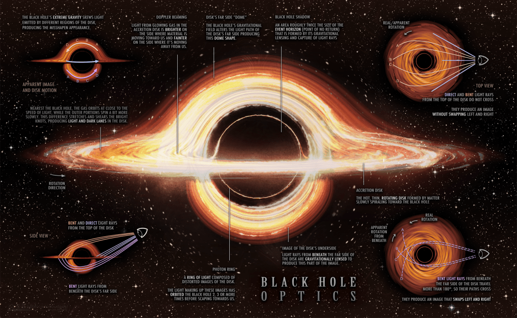 | Light Bending | The bending and curving of space-time caused by a black hole’s gravitational pull can cause the paths of light to bend and curve, known as gravitational lensing. |
